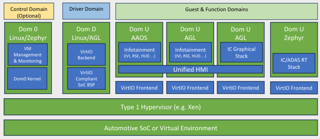 The architecture relies on several key technologies to achieve isolation and flexibility. The platform utilises Xen (a type-1 hypervisor) alongside Linux containers to run multiple functions – such as the instrument cluster and infotainment systems – on a single processor without interference.